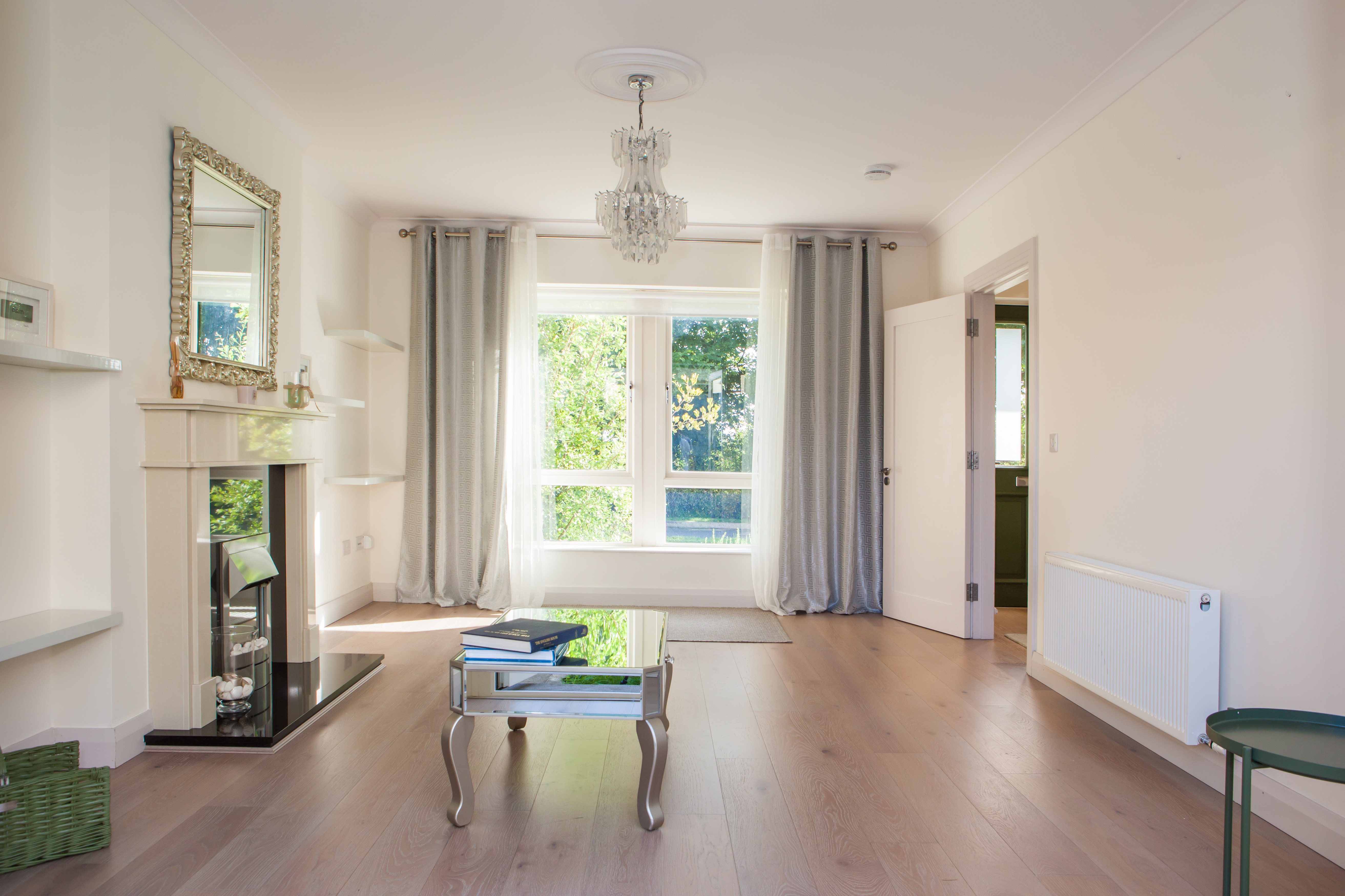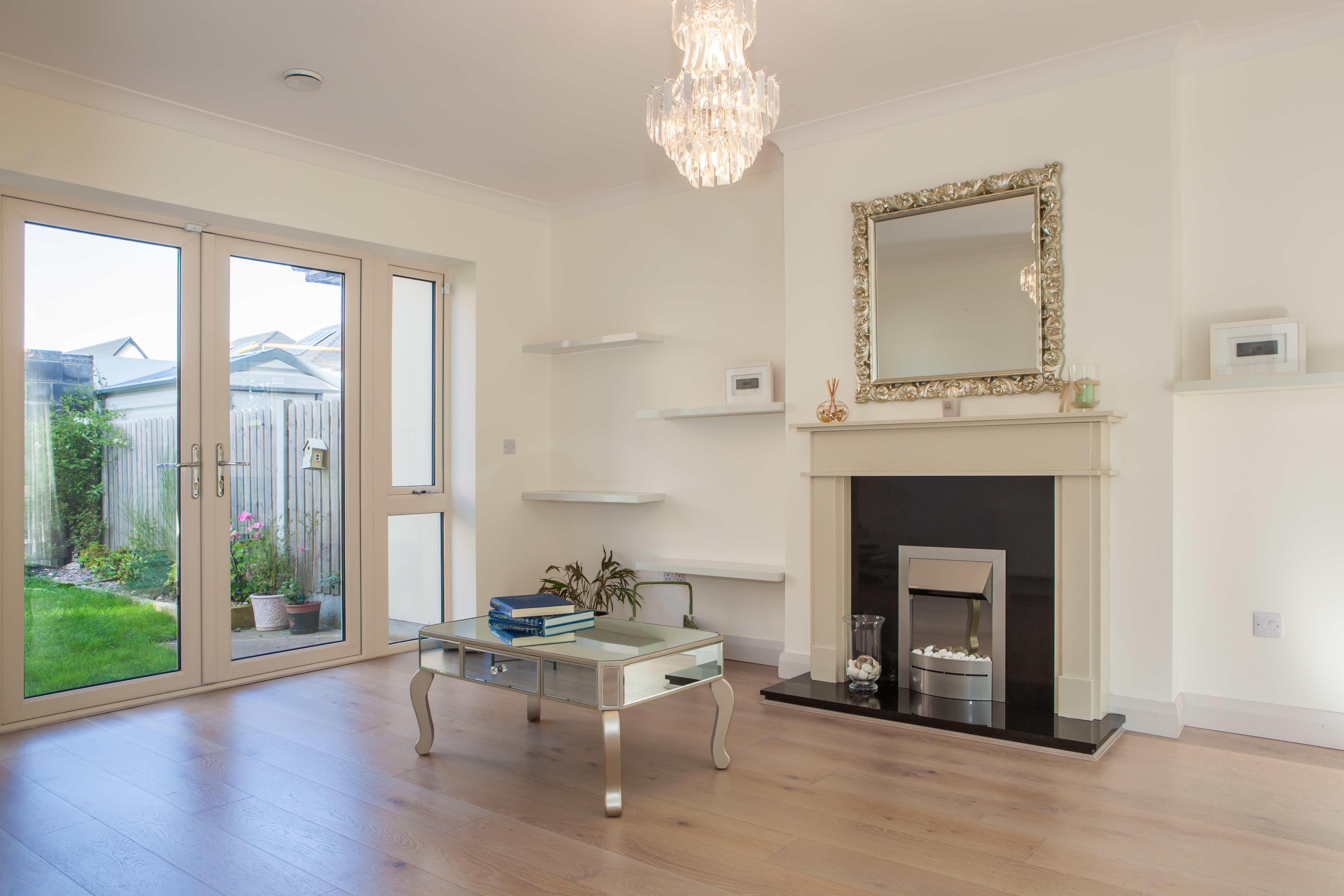The living room with generous windows has a fireplace made by Stonefacings with elegant marble surround and double french doors to the rear garden.