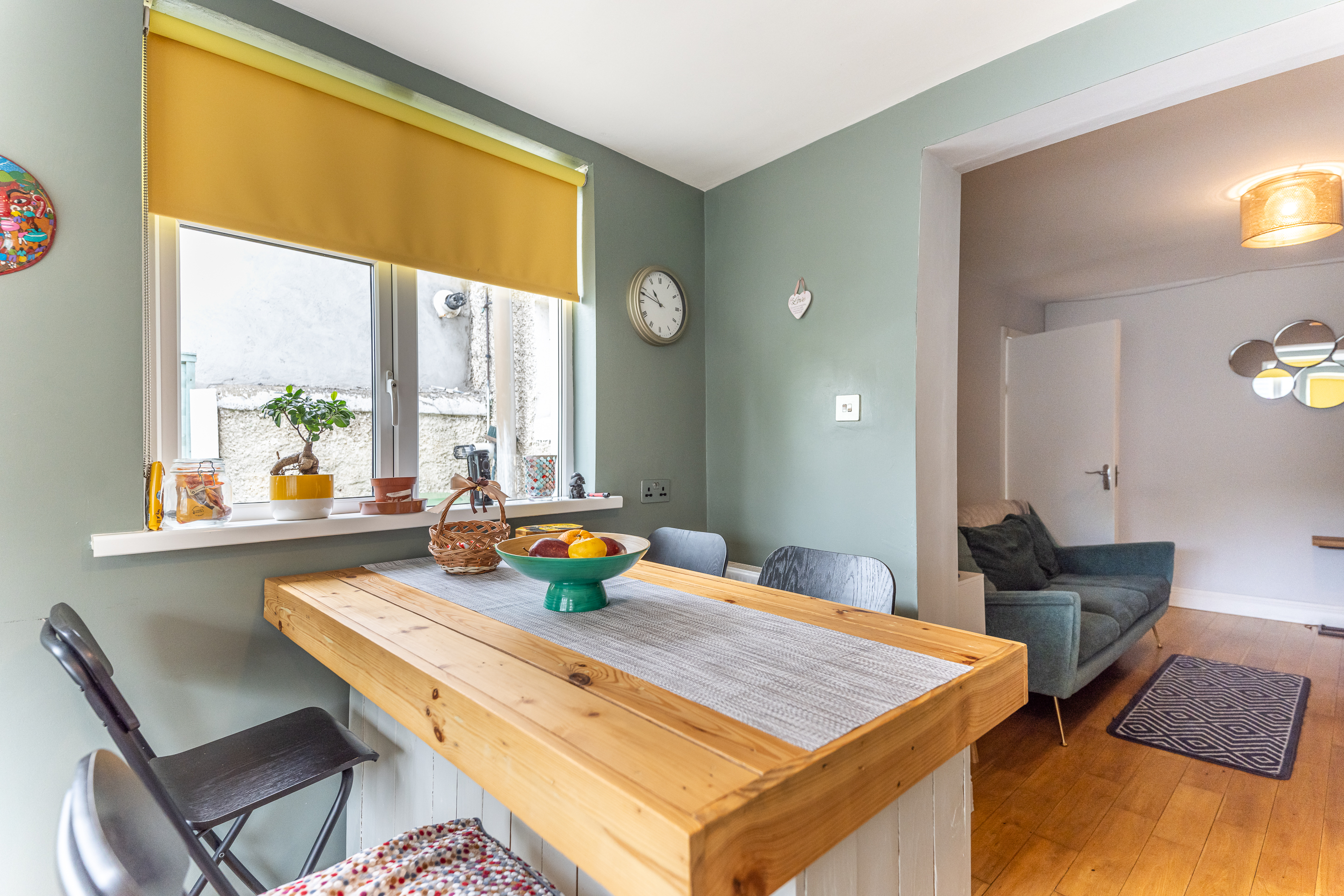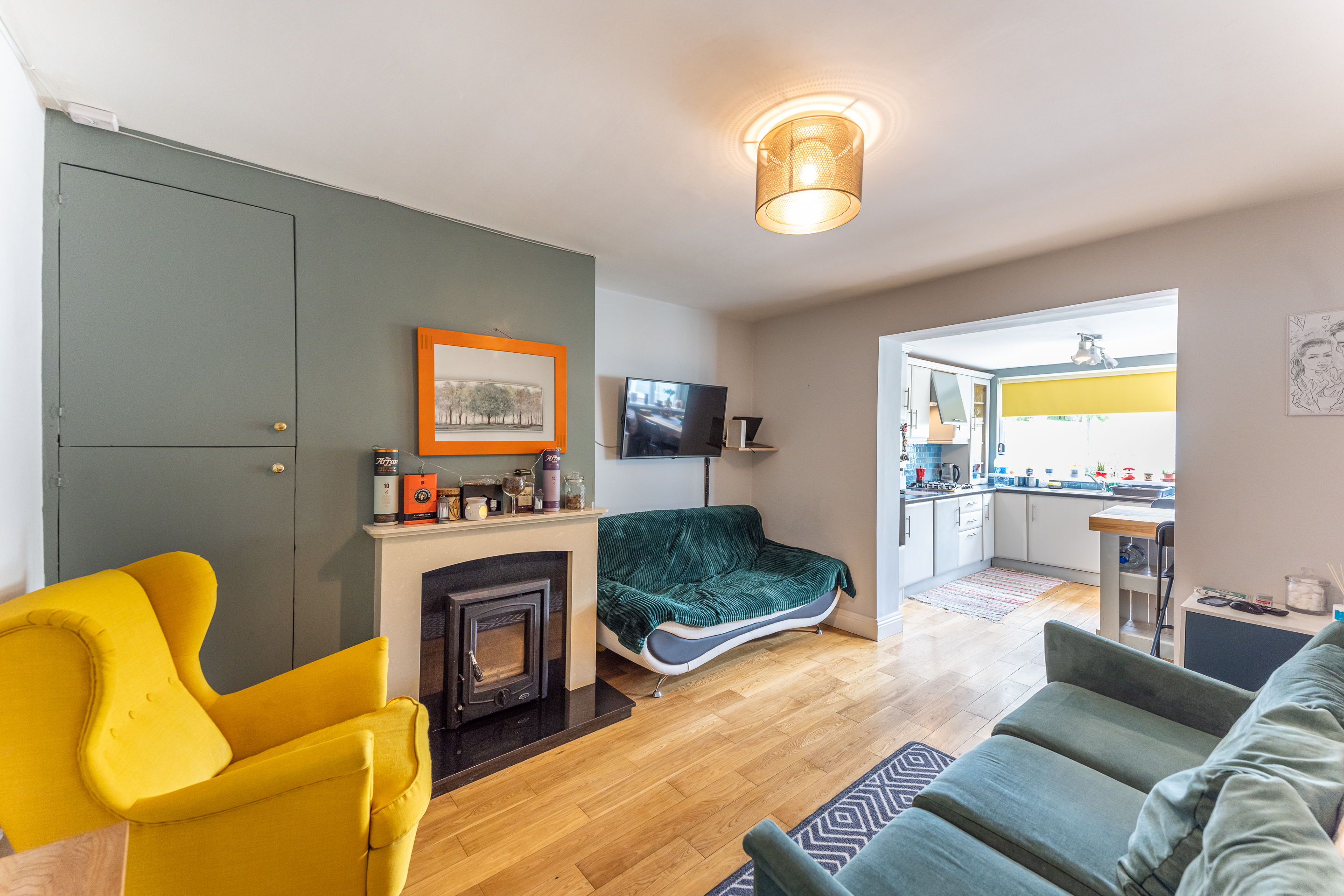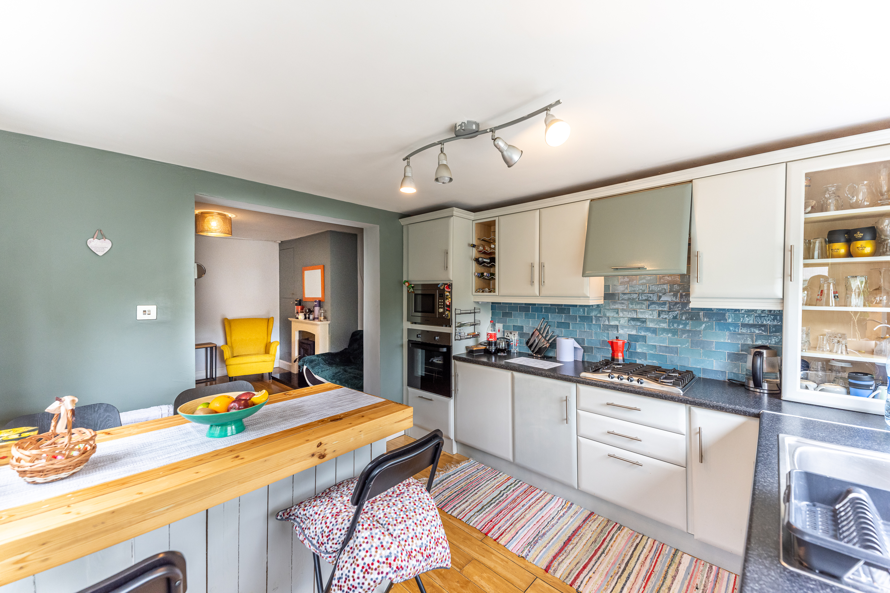 The ground floor consists of an entrance hall with understairs storage and wooden solid floors. The parlour room is generous in space and comes with wooden solid floors. The open plan living room/kitchen is bright and spacious and comes with a wood burner stove and colourful furnishings. The kitchen is the real gem of the house with its south-facing aspect, built-in units, gas hob, and breakfast bar. This room was built for entertaining.