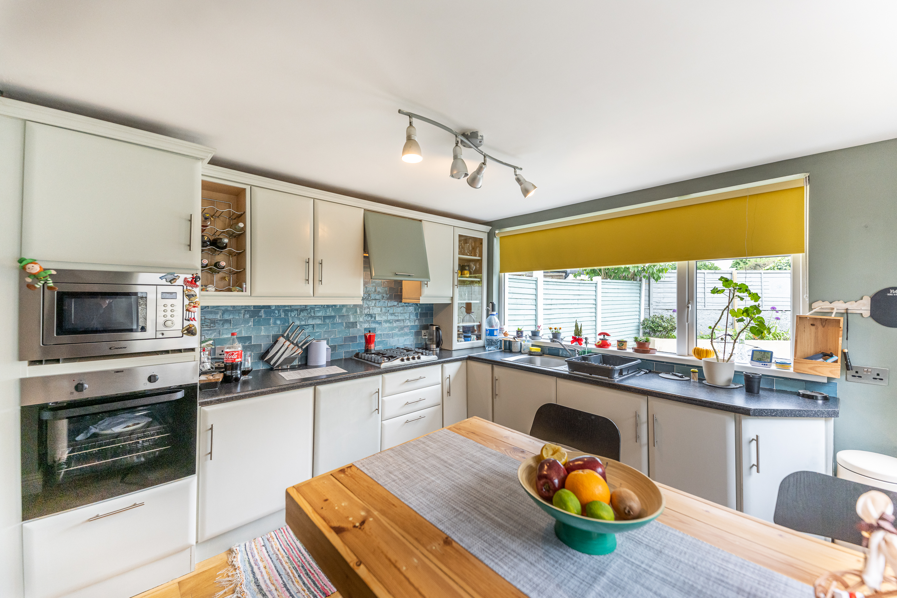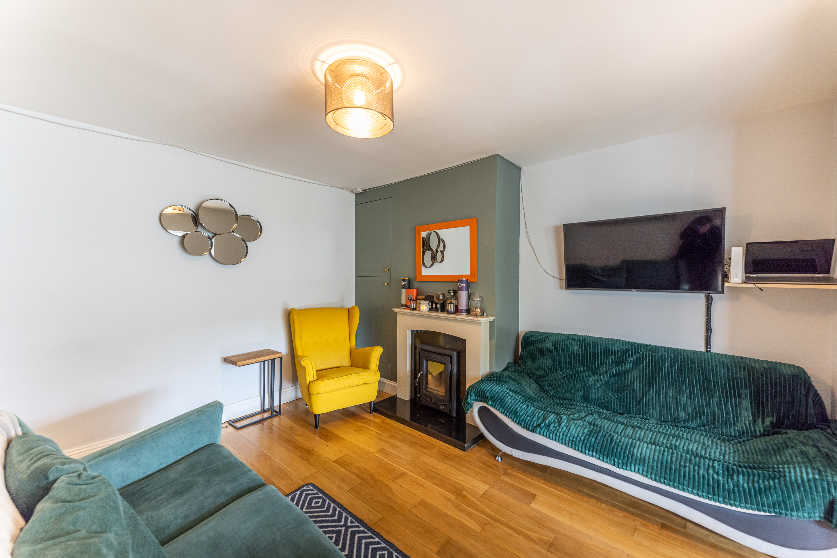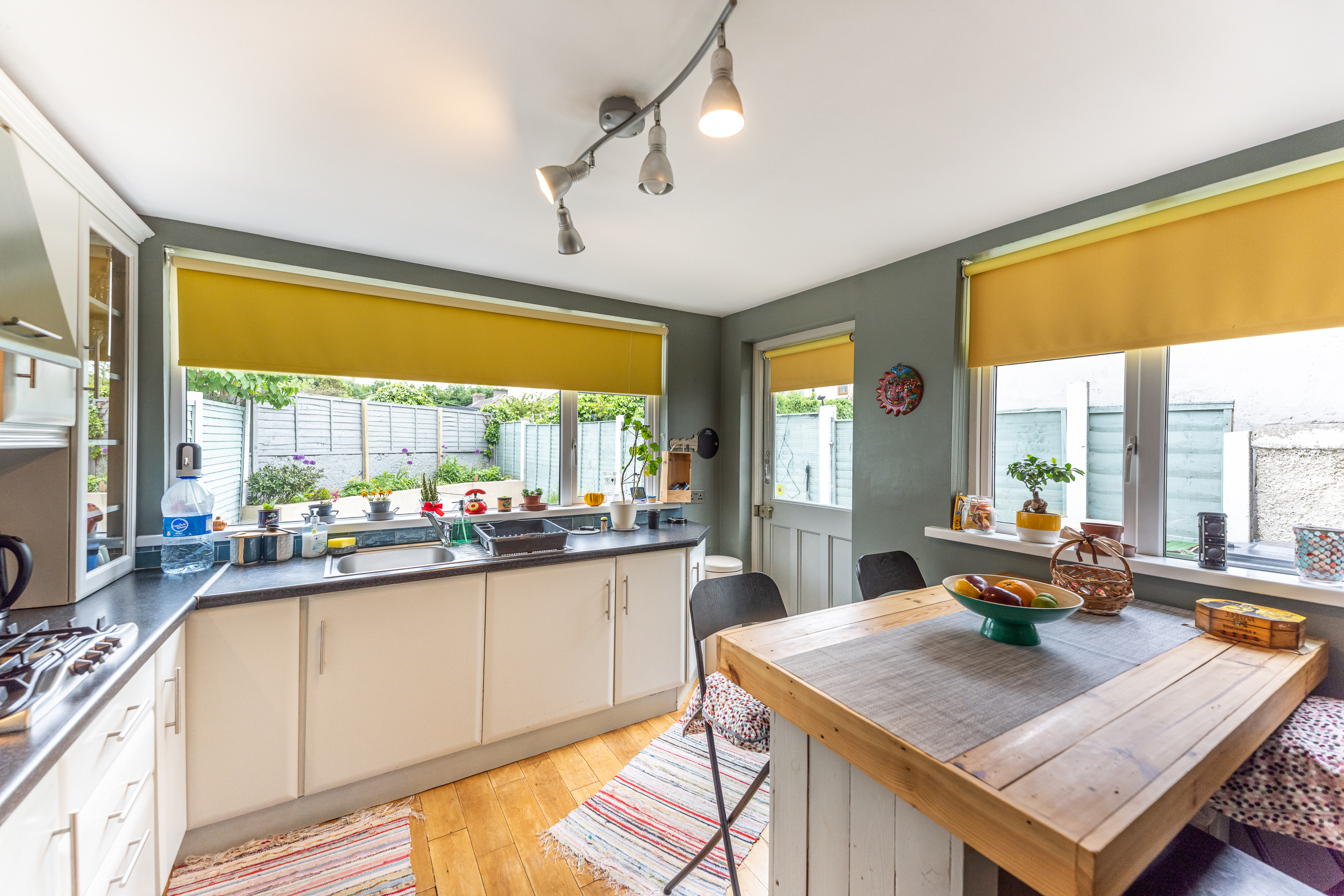 The ground floor consists of an entrance hall with understairs storage and wooden solid floors. The parlour room is generous in space and comes with wooden solid floors. The open plan living room/kitchen is bright and spacious and comes with a wood burner stove and colourful furnishings. The kitchen is the real gem of the house with its south-facing aspect, built-in units, gas hob, and breakfast bar. This room was built for entertaining.