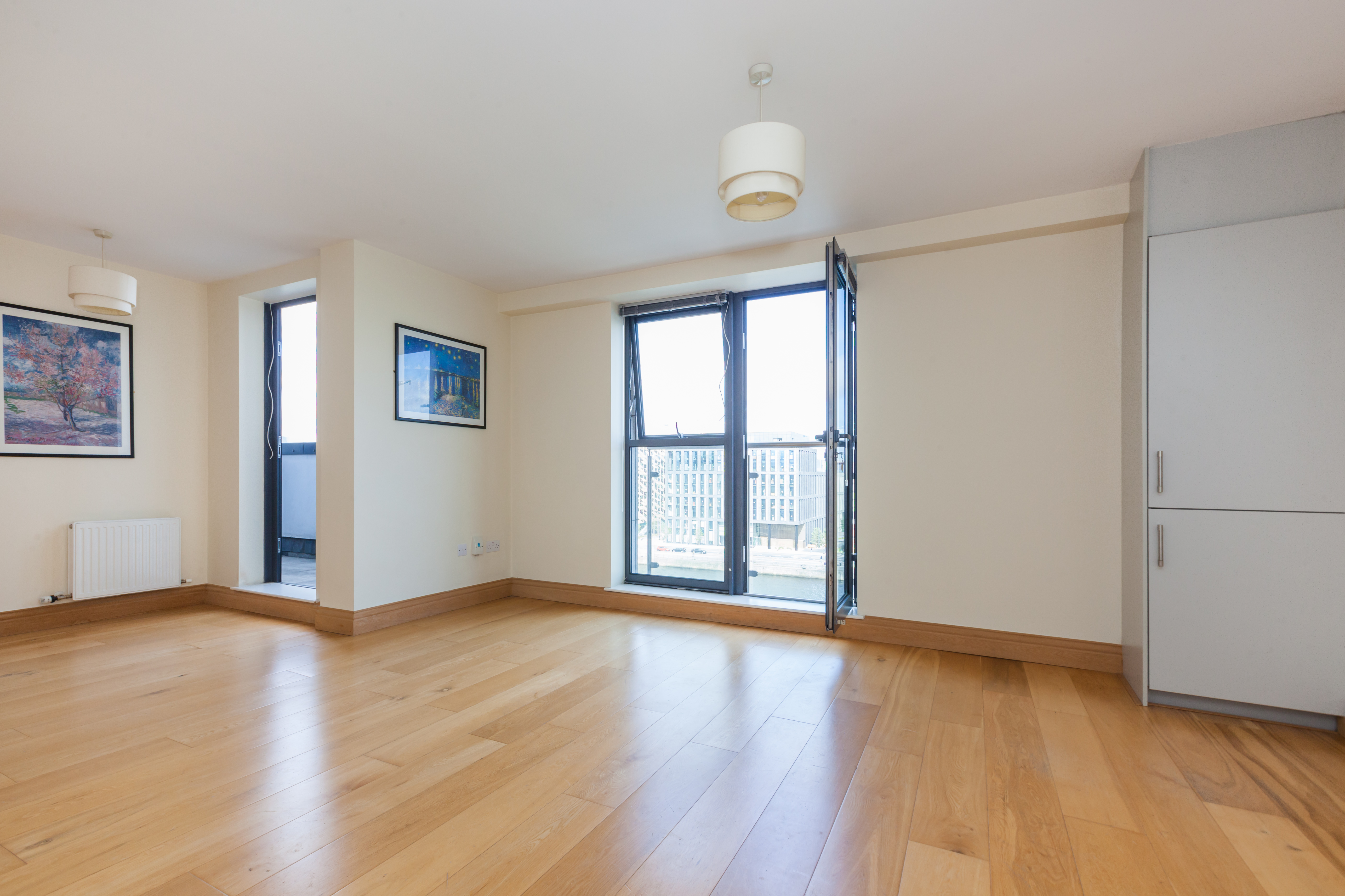 Wooden floor, access to balcony with views of the city skyline