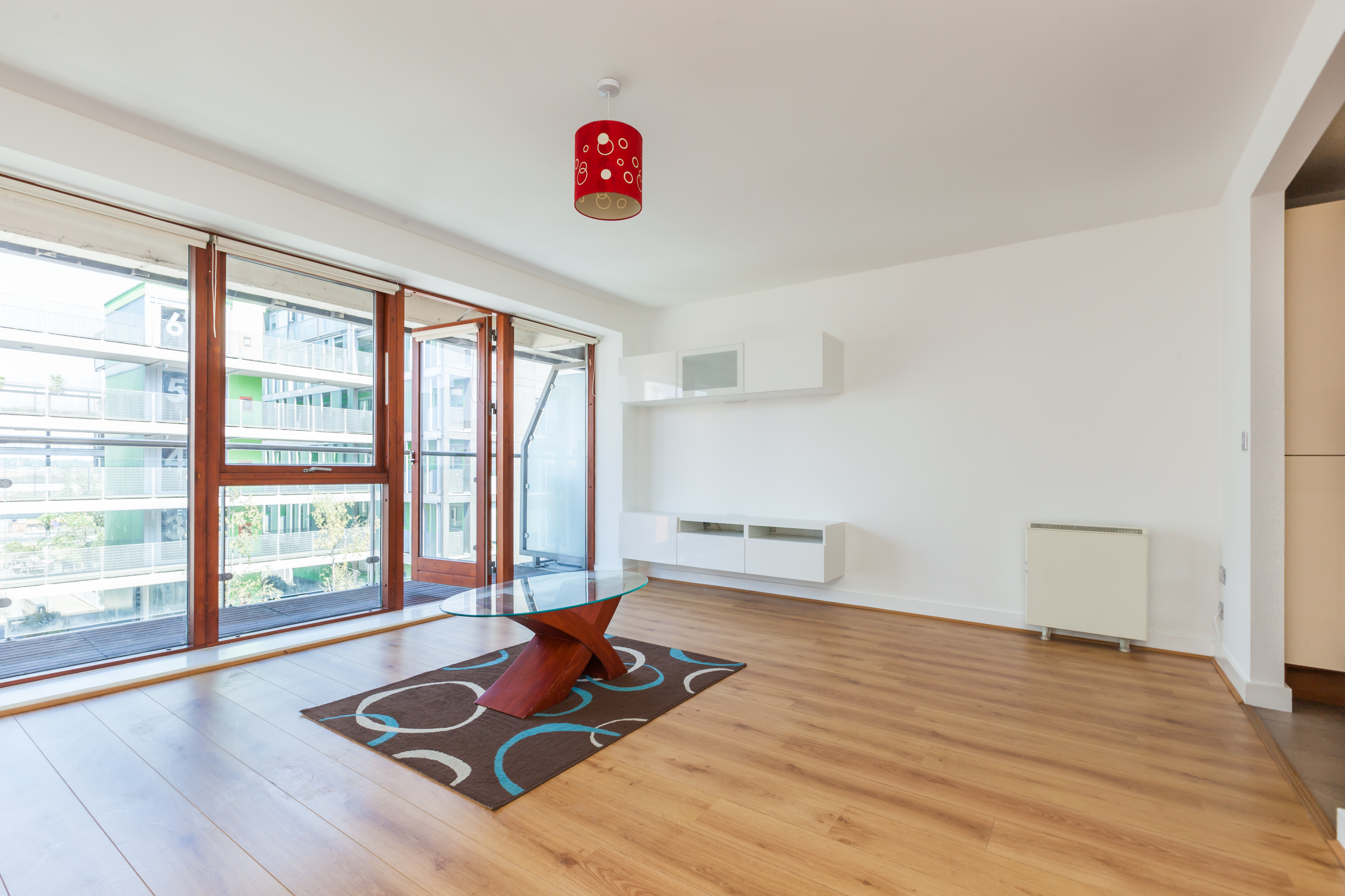 Wooden floor, Ceiling to floor windows and door leading to large balcony.