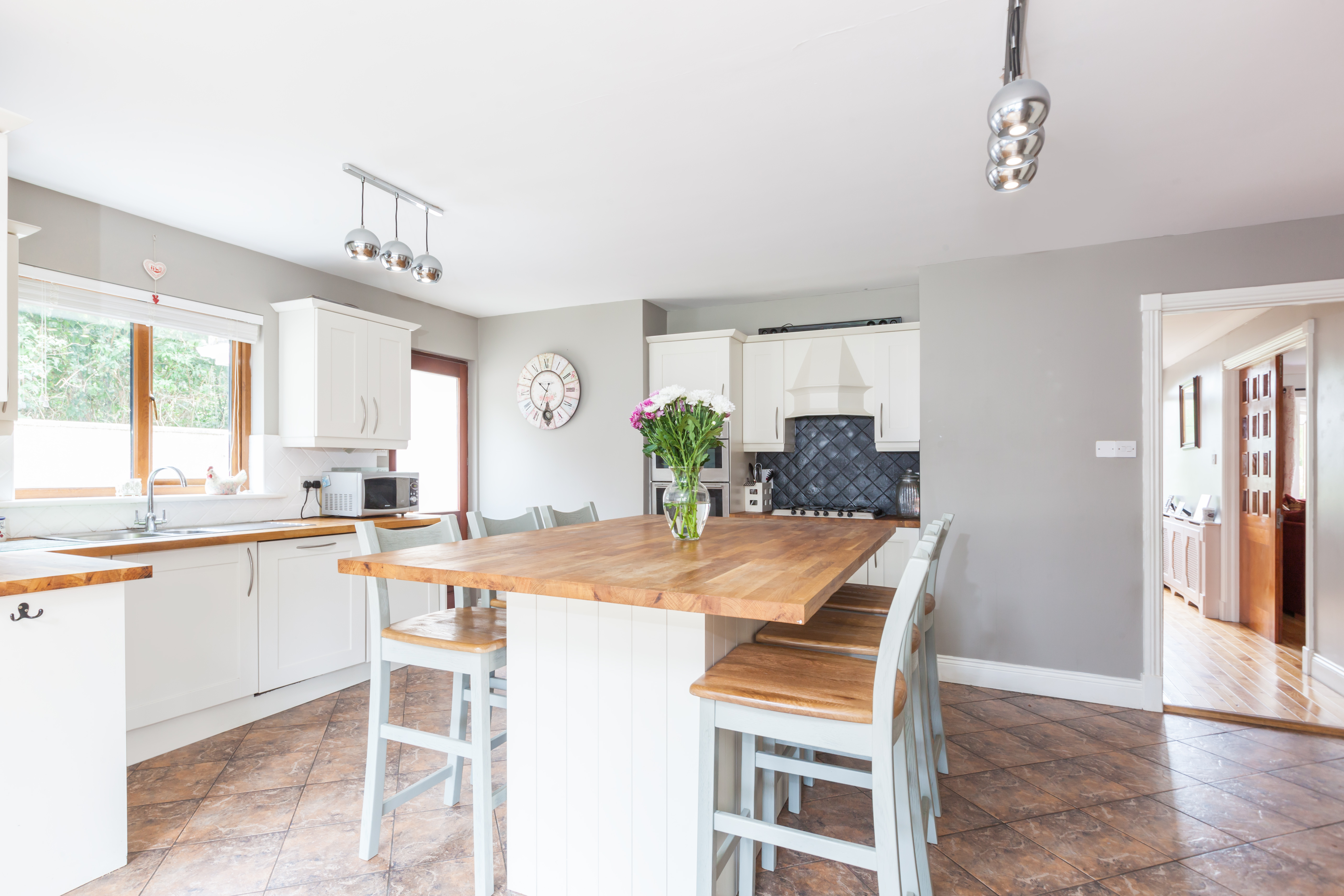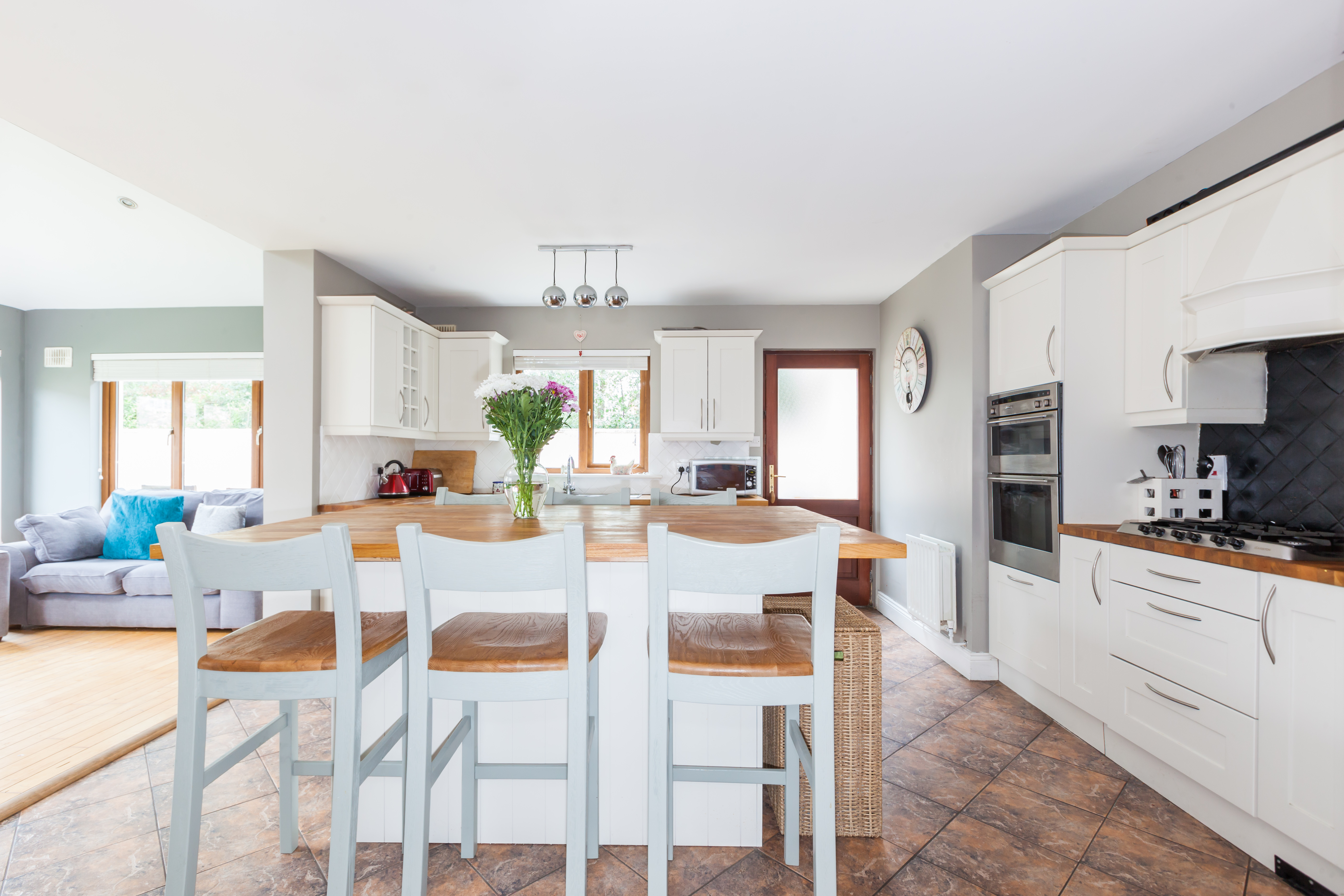 Fully fitted integrated kitchen, centre island, seating area.