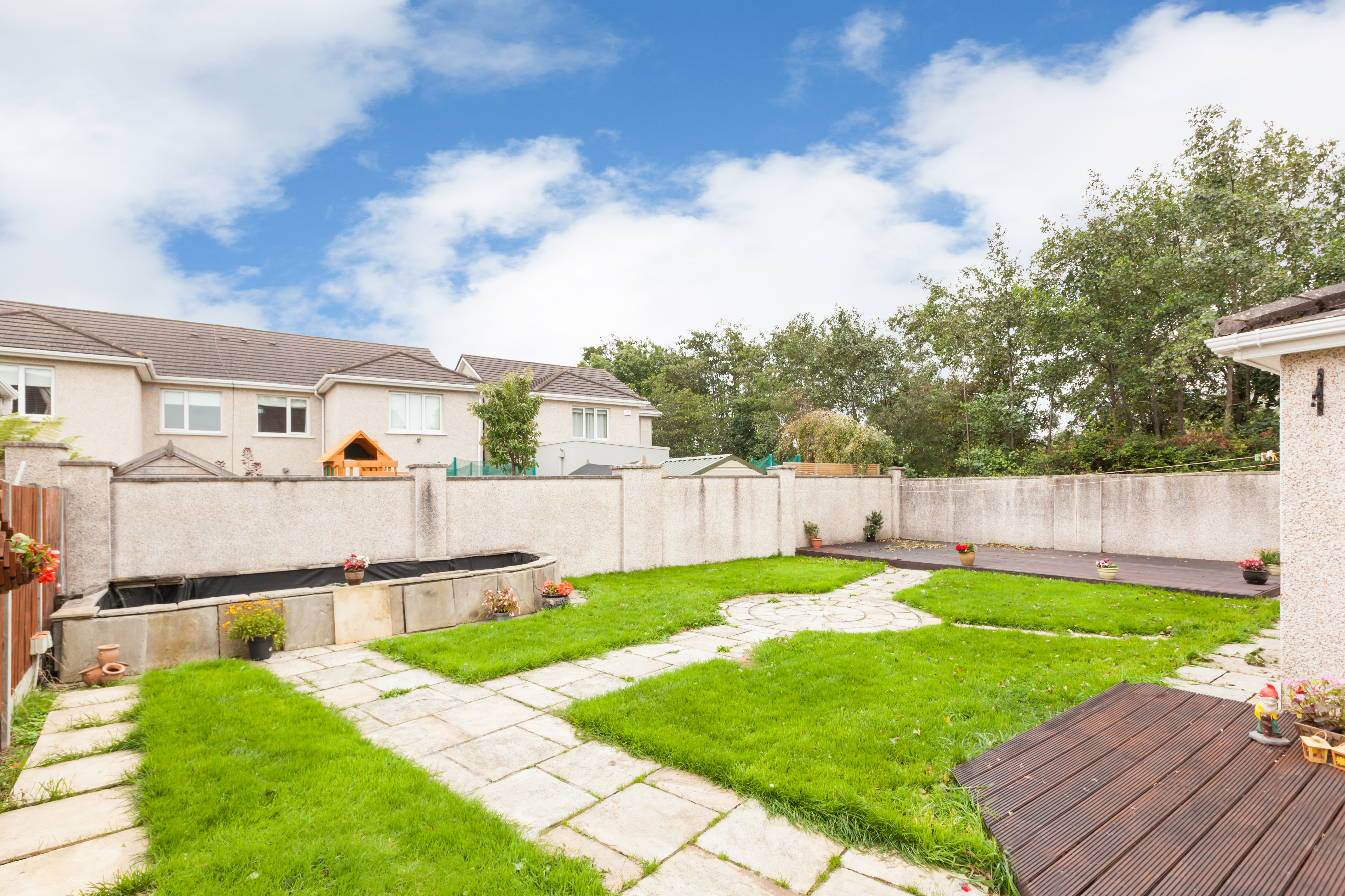 Walled, landscaped back garden with decorative stone, lawn area and a variety of shrubs and trees, decked patio area.