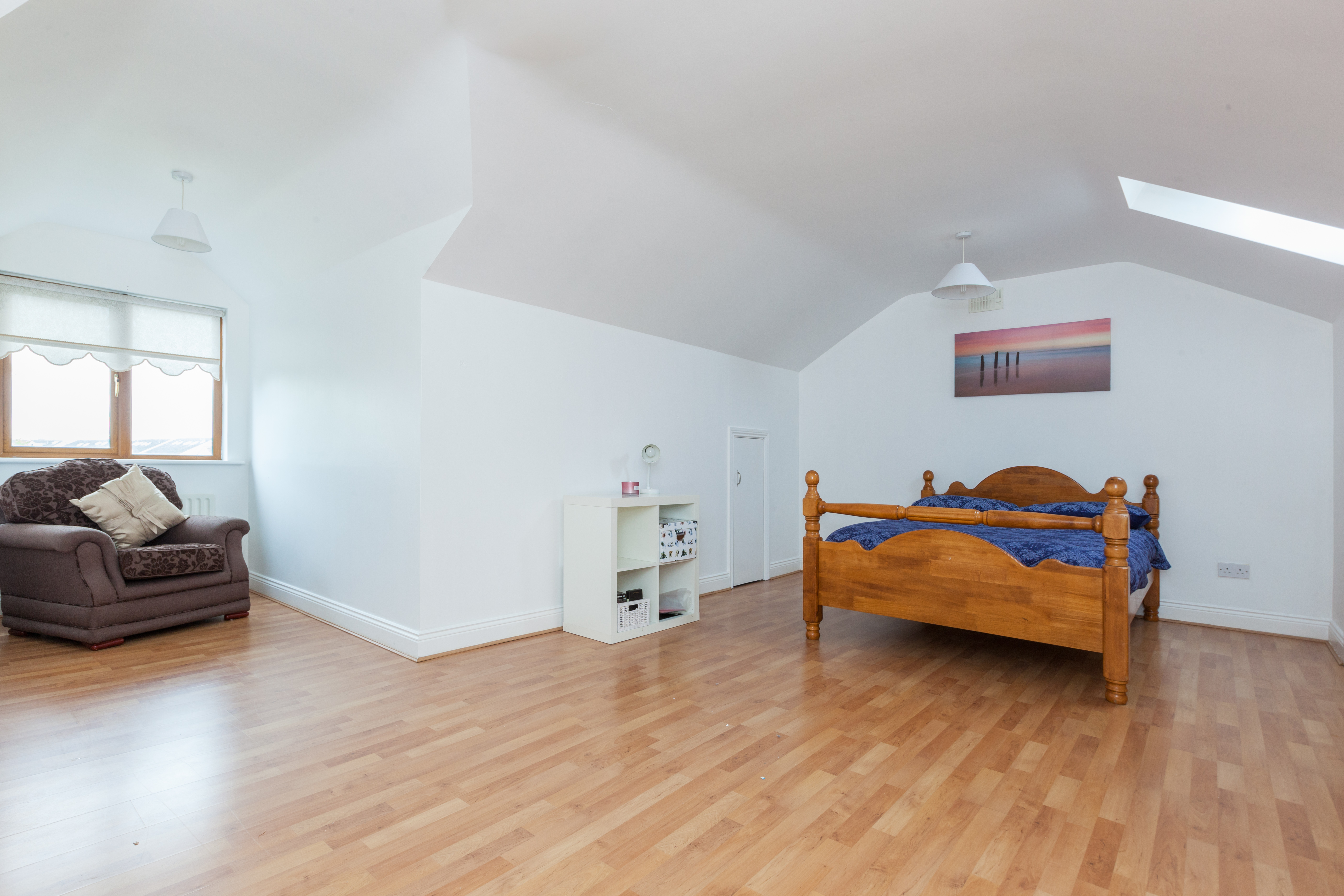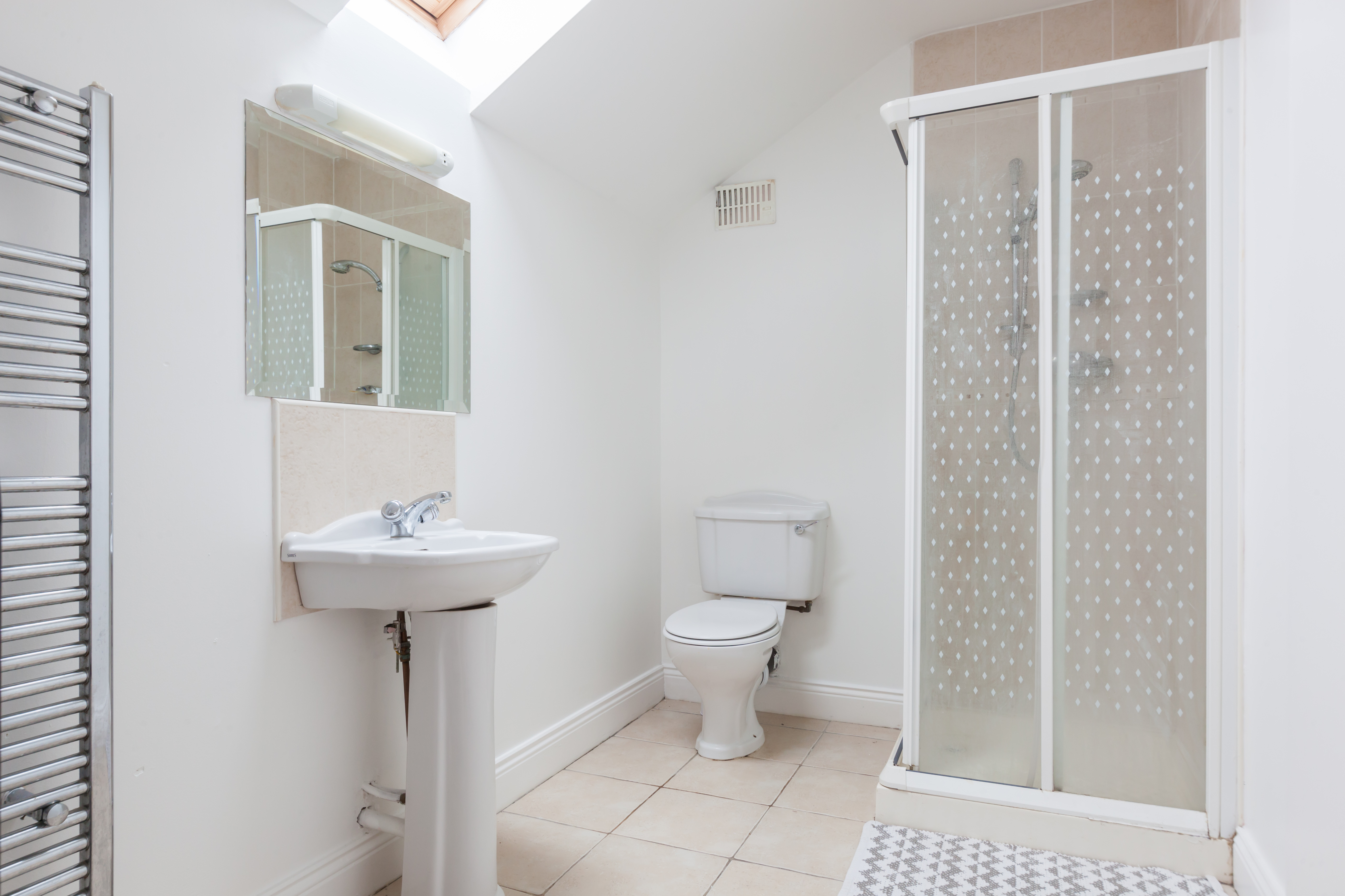 Wooden floors, corner shower unit, tiled floor, velux window.