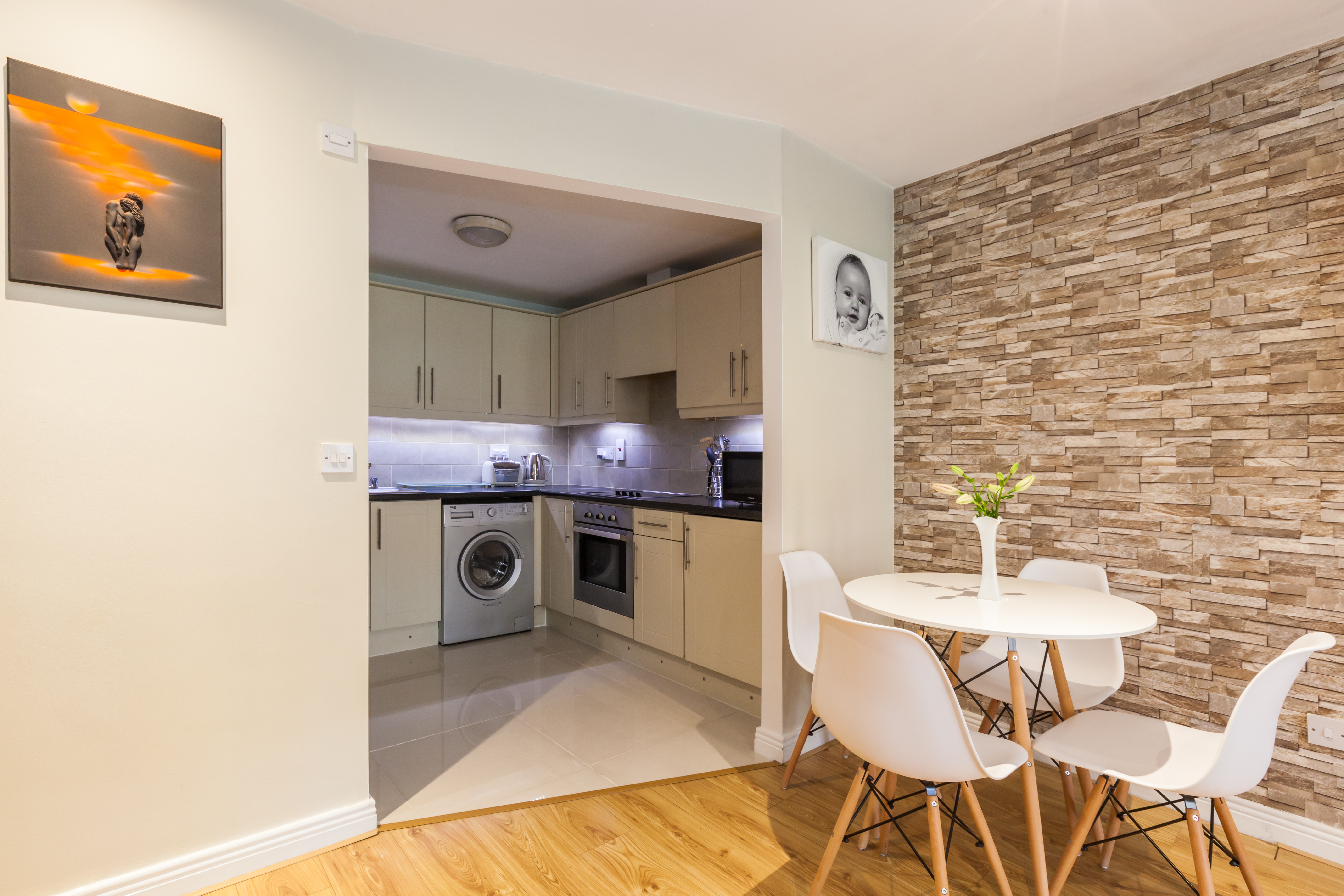 Kitchen – 2.7m X 2.5m Modern, multiple floor & eye level units, tiled floor and splash back.