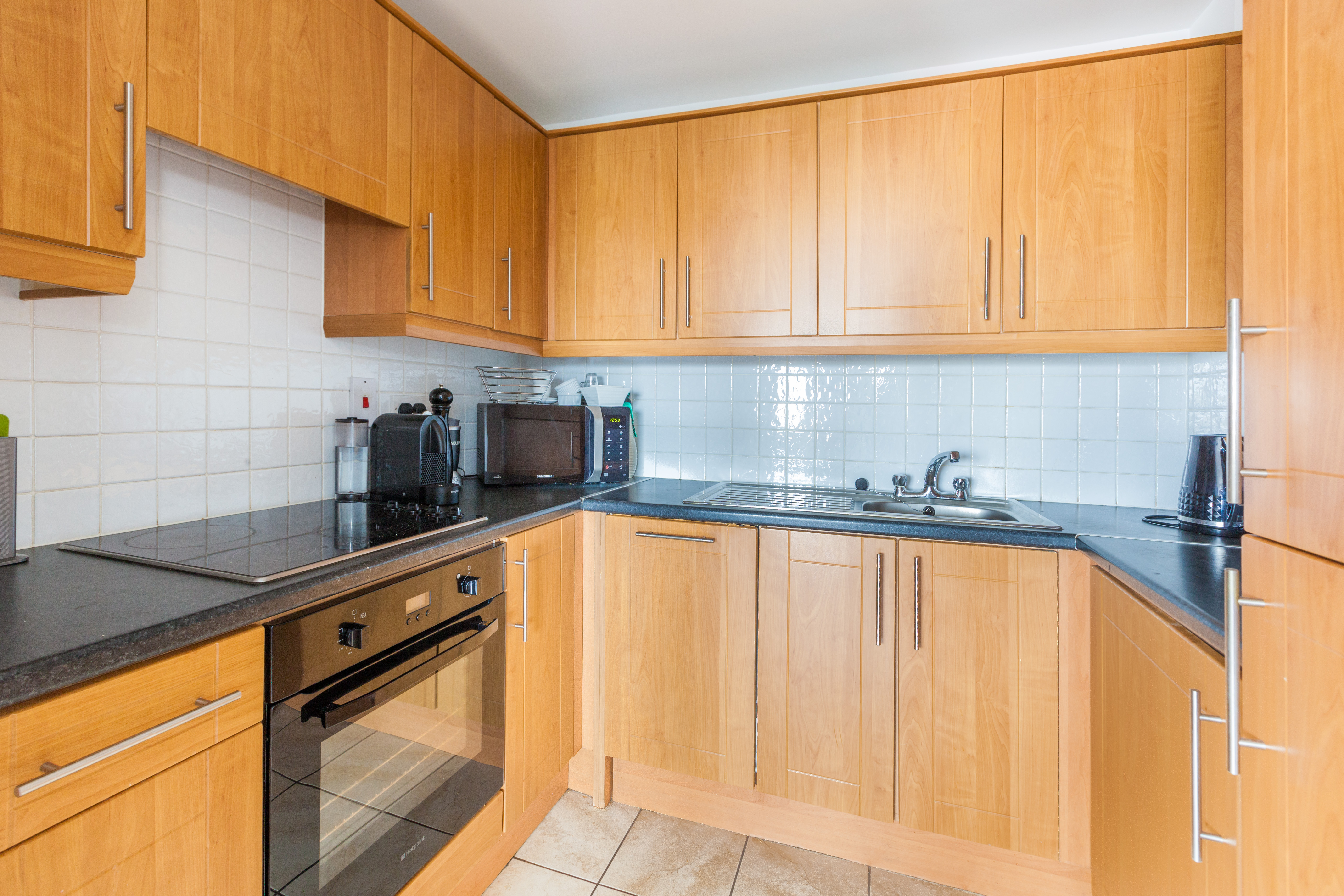 The kitchen is accessed through an arch from the main living space. It is a modern, tiled kitchen with integrated units.